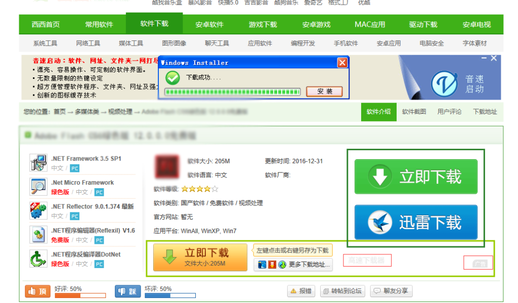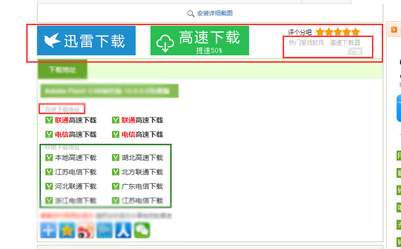 - 不要点击高速下载那一栏目的链接(见图1-2中,第二个红色框圈起的位置),高速下载,是指使用高速下载器进行的下载,而很多高速下载器,都会捆绑不是你现在所需要的软件,以及很多广告(一般是页游,有些直接就是客户端),还有可能含有其他一些我也不太了解的东西,总之尽量避免使用。