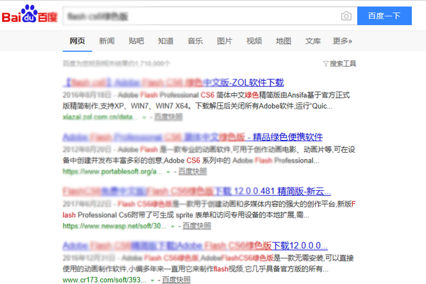 打开浏览器,进入一个搜索引擎,我自己喜欢用百度,然后输入想要下载的软件名称,回车,这个时候就可以得到一堆搜索结果,就像这样: