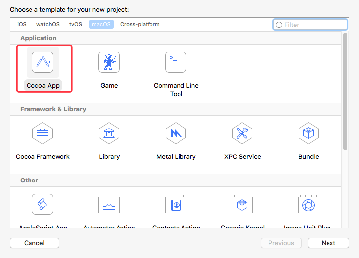 接下来选择“cocoa app”,如果使用其他类型的Project,那么finder extension将会不能正常启动。