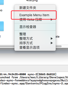 稍等片刻后,就能看到XCode输出了一些log,这时去Finder中点击右键即可看到新增的“Example Menu Item”。