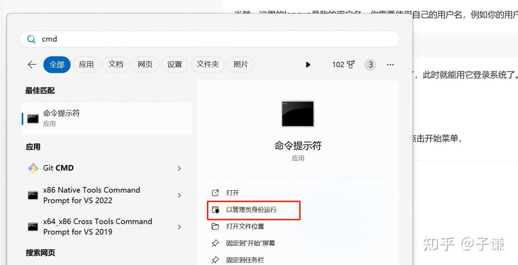 找到命令提示符,右侧有“以管理员身份运行”,由于已经进入系统了,你就能够复制接下来的命令,也不用担心出错了,所以你可以直接执行这些指令: