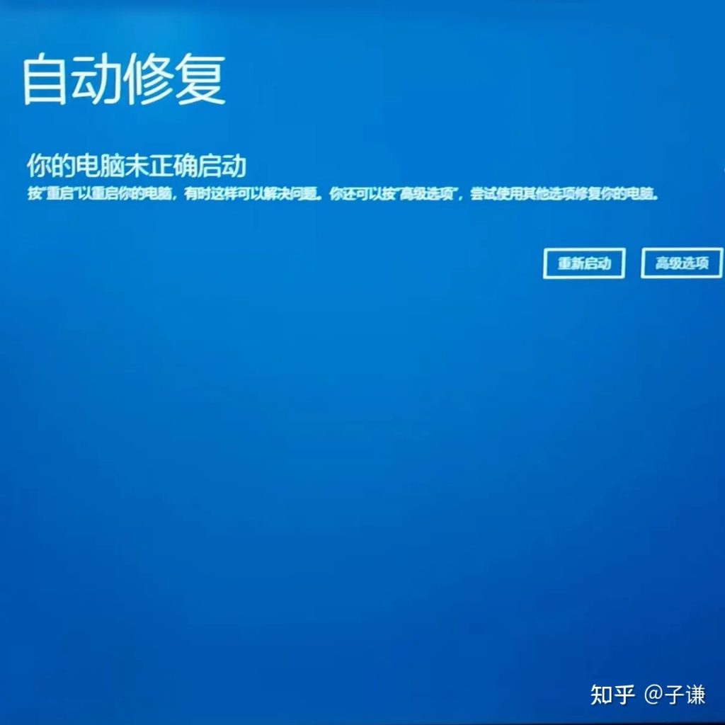 首先关闭设备,然后在设备启动的过程中,屏幕亮起,显示电脑品牌的标志的时候,通过电源键强制关机,如此重复3次,那么下一次启动后就能够看到“自动修复”界面,此时,屏幕背景呈蓝色,有以下提示内容“你的电脑未正确启动,点击重启以重启你的电脑,有时这样可以解决问题”这行文本下方存在两个按钮,一个是“重新启动”,一个是“高级选项”。