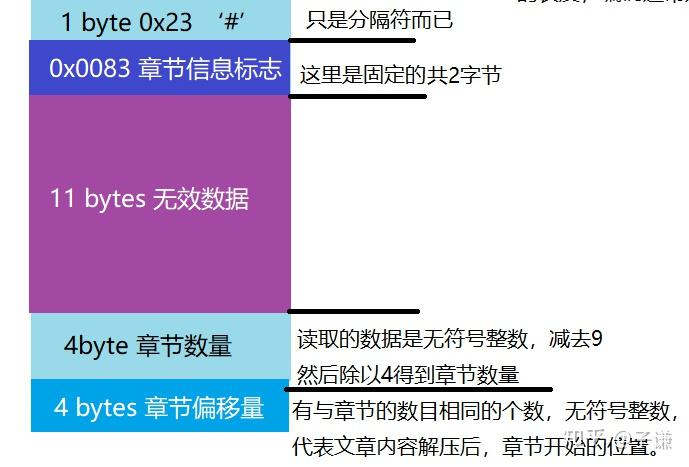 在metadata部分后,出现的是章节偏移信息,第一个字节是#,表示是一个新的部分,接下来是固定的两字节,内容为0x0083,代表这里是章节的偏移信息,章节的偏移信息是指在正文内容解压后,这一章节开始与整个正文的第几字节。