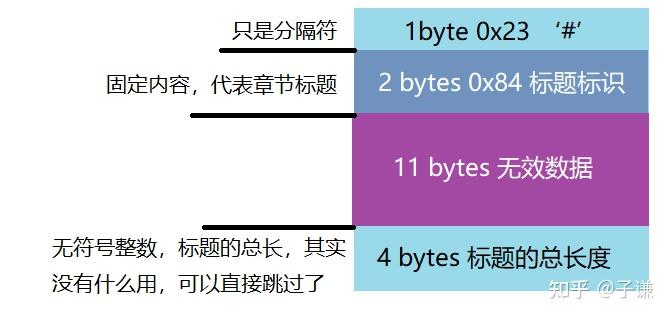 在偏移量读取完毕后,就能遇到下一个#分隔符了,同样它会占据一字节,接下来的是2字节的0x84,这代表接下来的数据是章节的标题,到了这里,可以之间跳过15字节,因为在之前以及读取到了章节数量,可以直接使用那个。