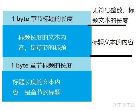 上图代表了一个章节标题的数据结构,首先读取1字节,这是标题文本的长度,它是一个无符号整数,接下来直接使用这个长度读取章节的标题,并且使用UTF-16LE编码为字符串——这就是章节的标题,我们之前得到了章节的数量,因此通过循环就能读取到每一个章节的标题。