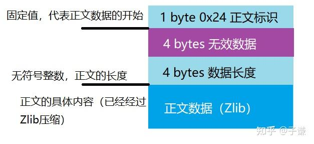 在标题得到正确的处理之后,接下来就是正文的内容了,正文由数据块组成,其中的内容经过了Zlib的压缩,因此需要按照数据块的结构进行读取,正文数据块开始的标志是0x24,在这之后,就是4字节的无效数据,直接跳过就好,紧接着就是4字节的无符号整数,此数值减去9就是被压缩的正文数据的长度。